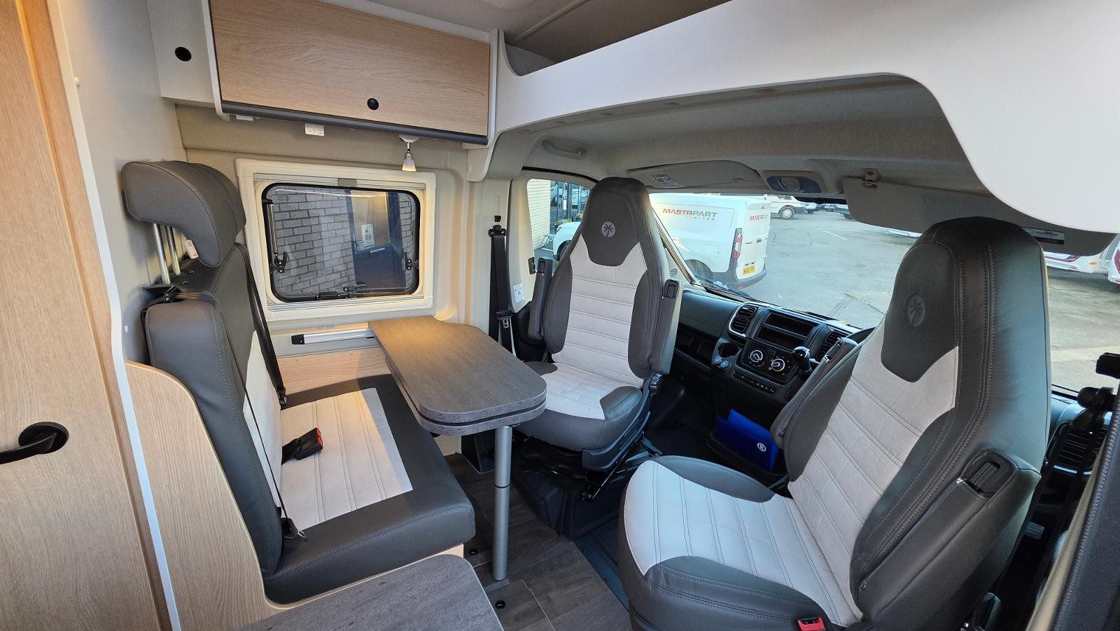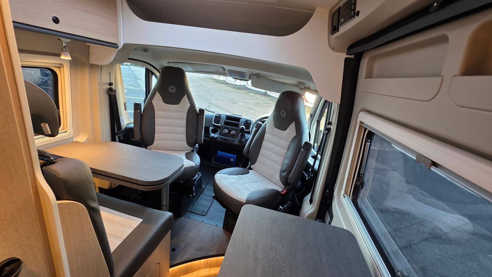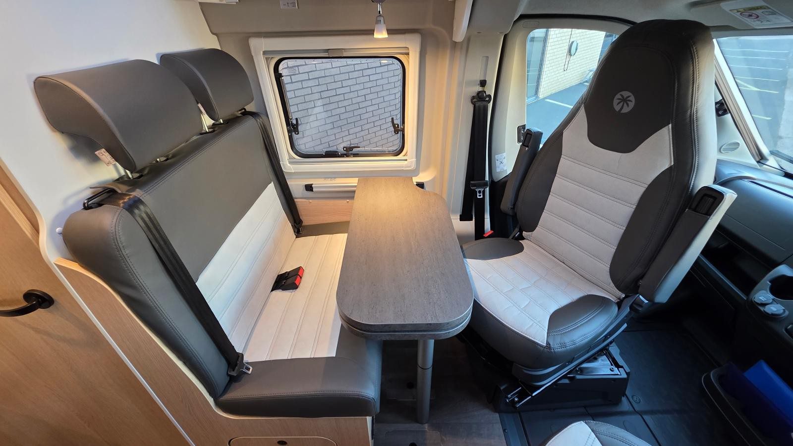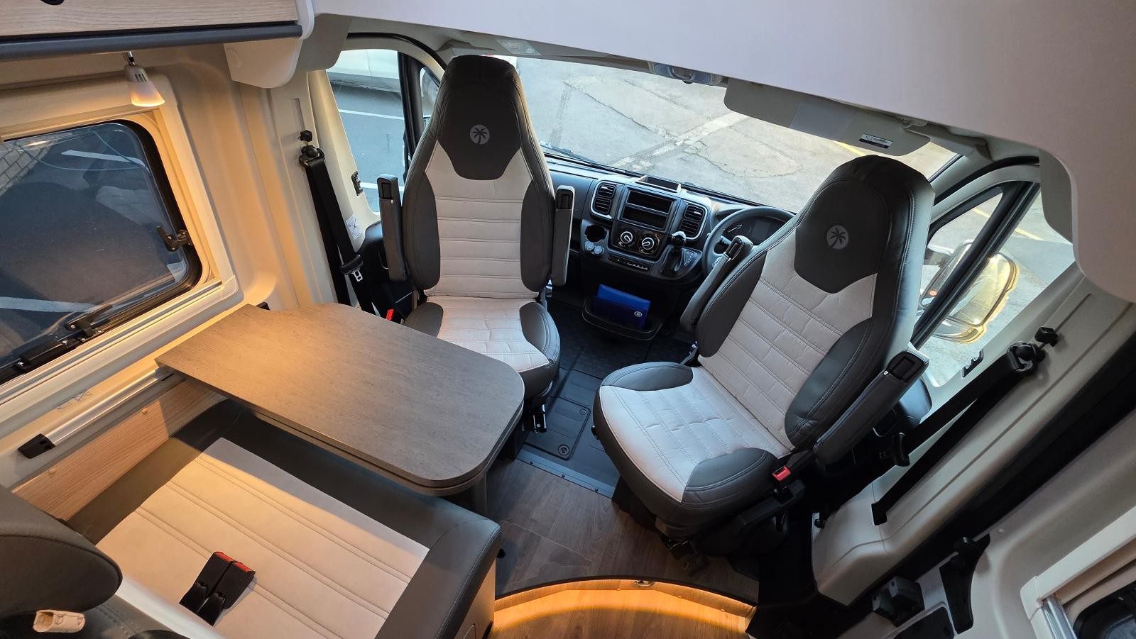Swivel captain’s seats creating lounge/dining area with dinette table