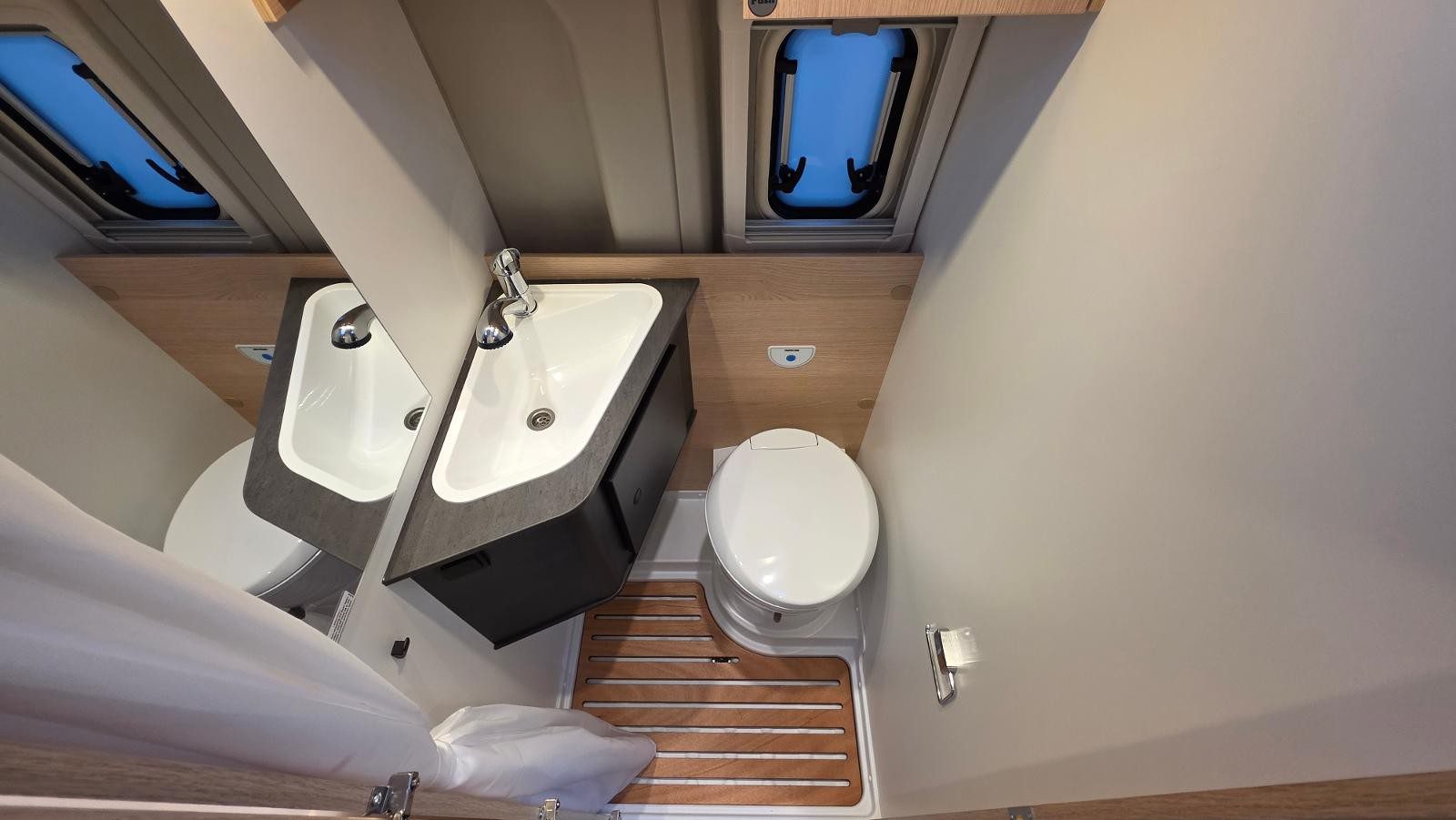Bathroom: full washroom with shower, cassette toilet, sink, mirror & duckboard