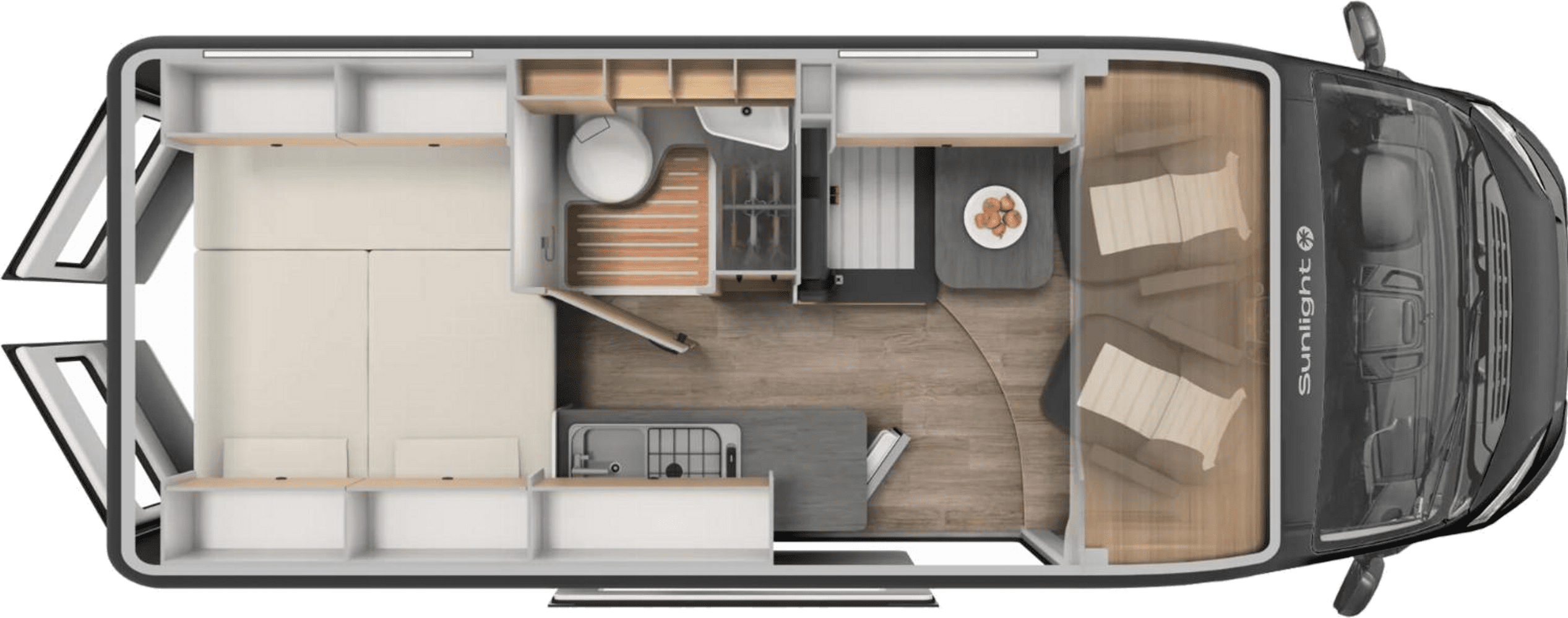 4 berths: rear transverse double bed + pop-top roof bed