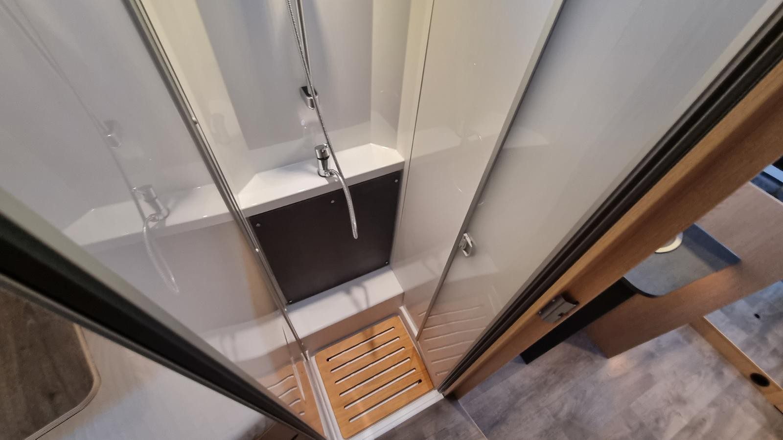 Bathroom with separate shower, cassette toilet, and wooden duckboard