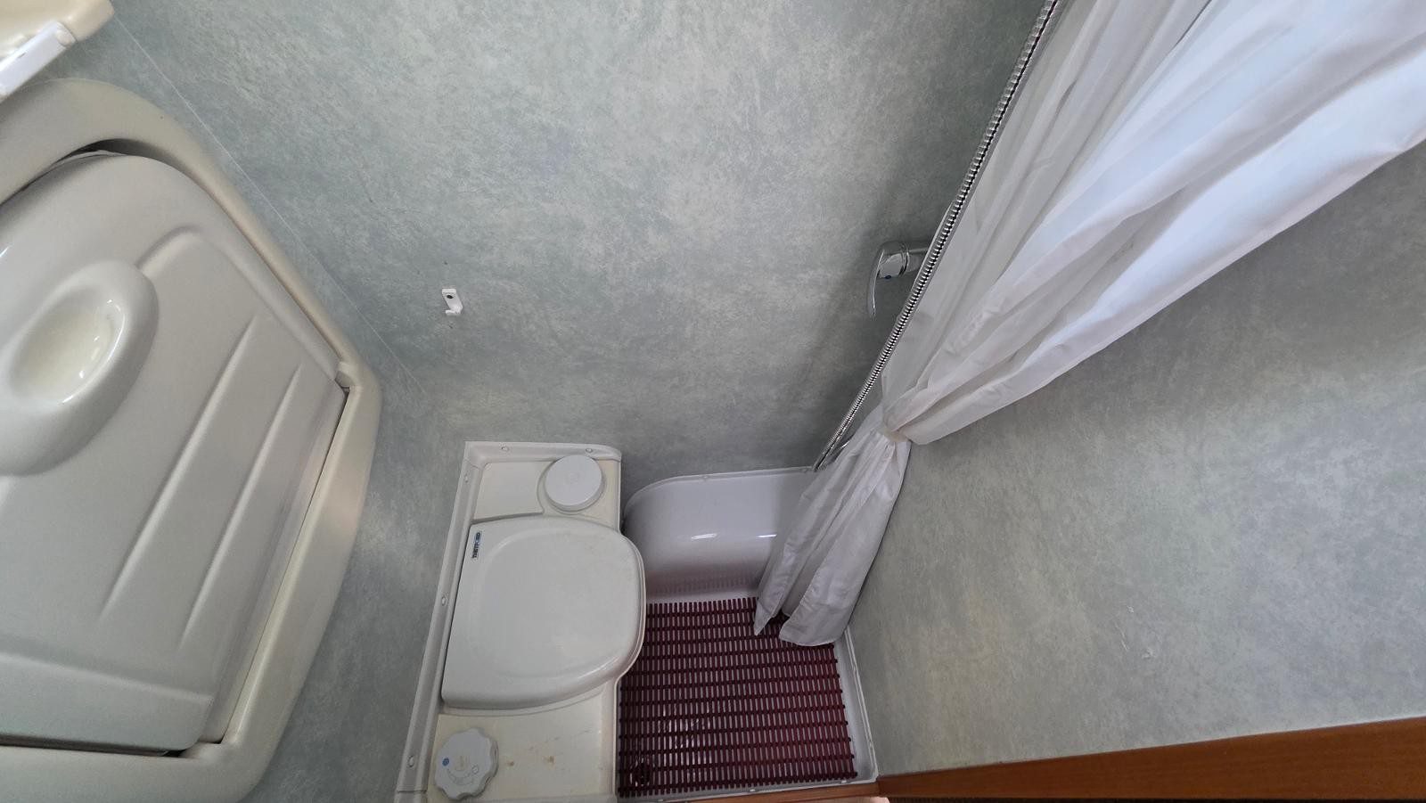 Rear washroom: Thetford cassette toilet, shower, fold-down basin, door creates changing area