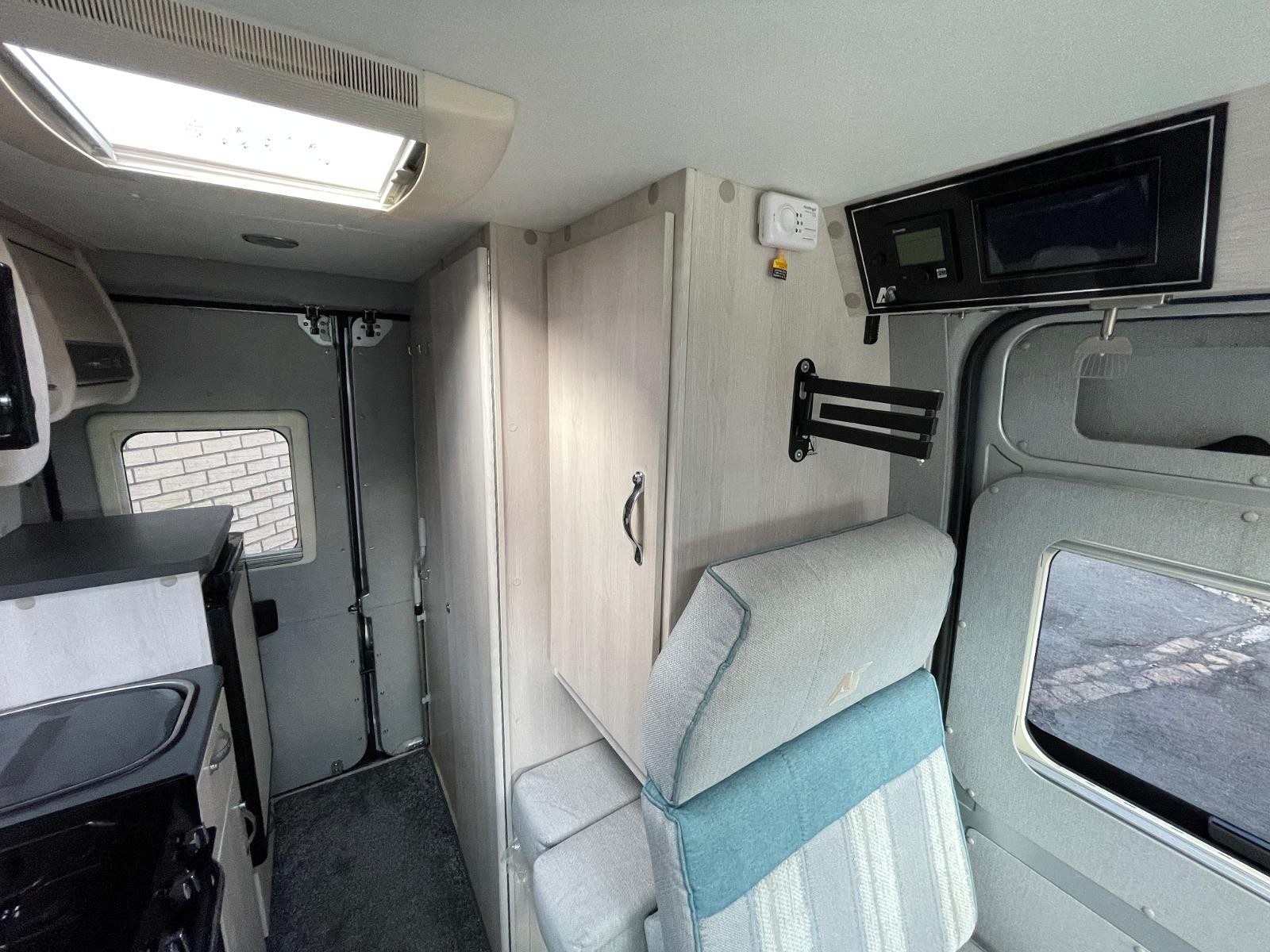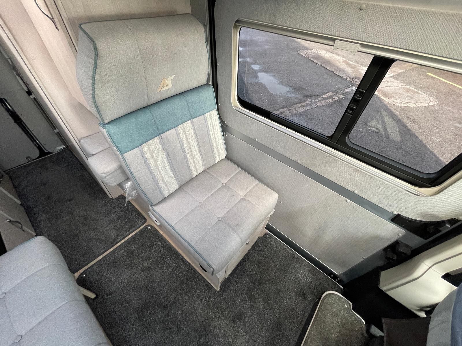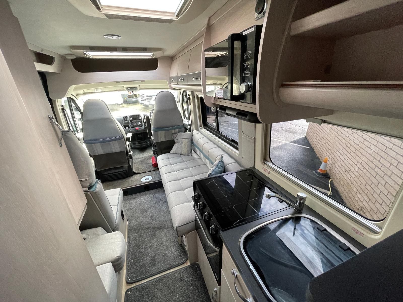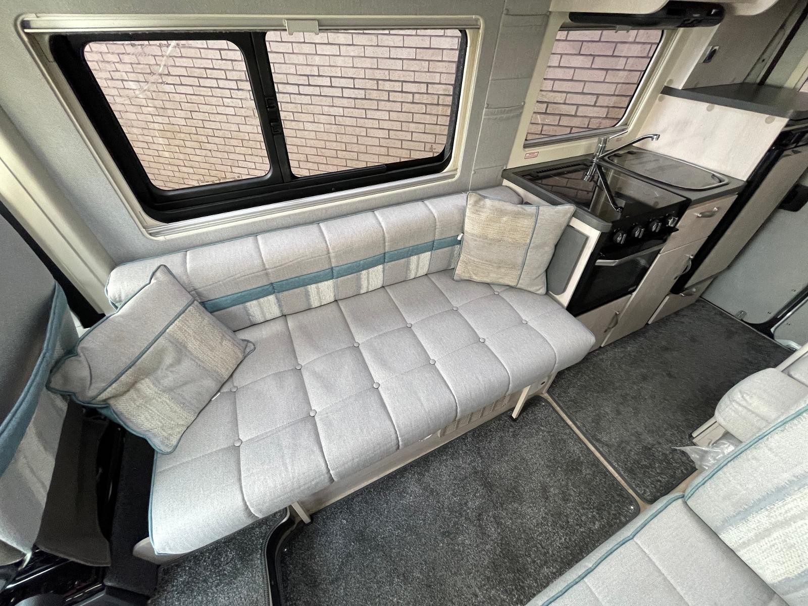 Living Area: Front lounge/diner converts to single or double beds; side-facing sofa and forward-facing seat with seatbelt