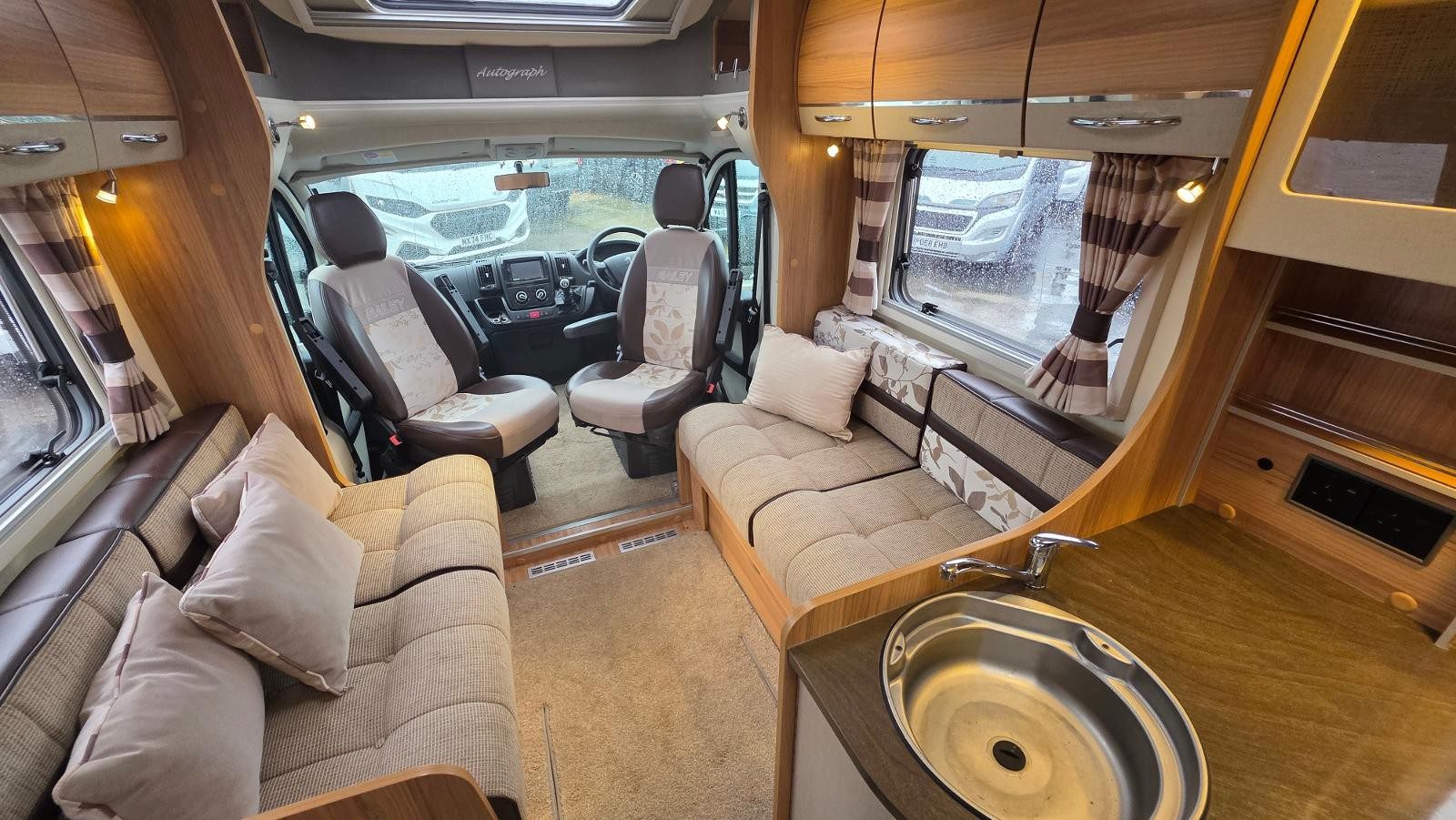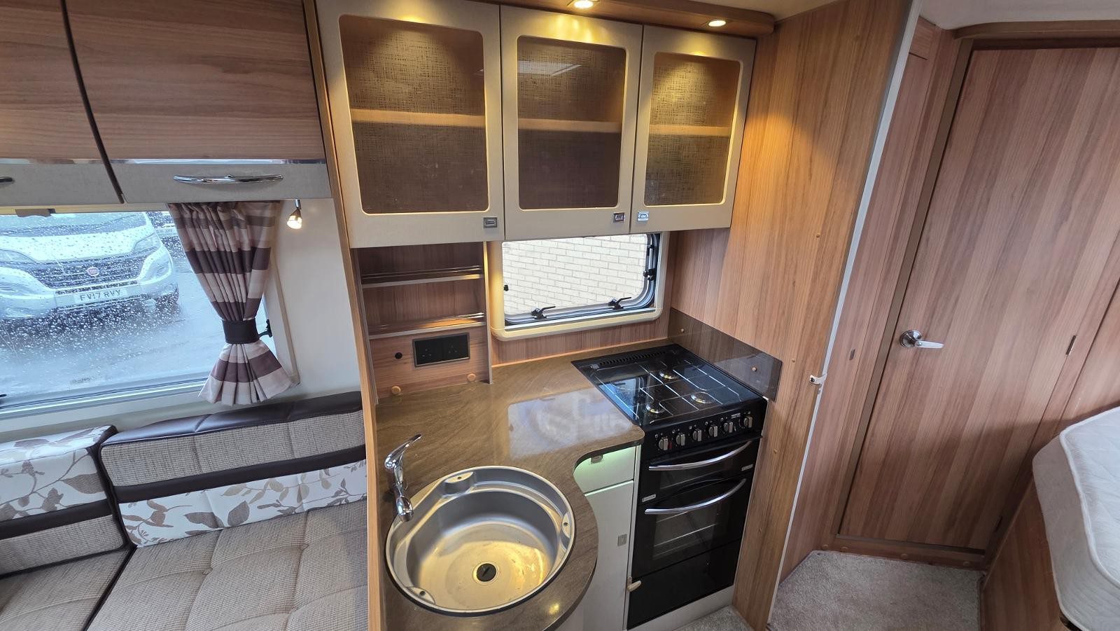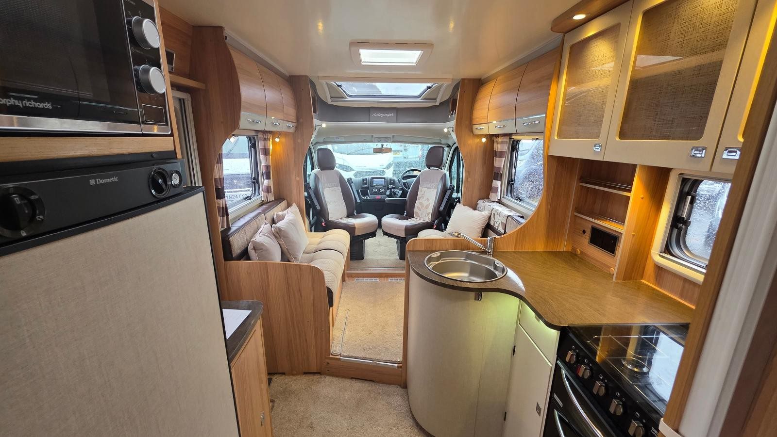 12V Lighting, 240V Lighting, Awning, Blinds, Central Heating, Cooker, Double Glazing, Fixed Double Bed, Grill, Hand Washbasin, Mains Hookup, Microwave, Oven, Separate Shower, Sink, Sunroof, TV Aerial