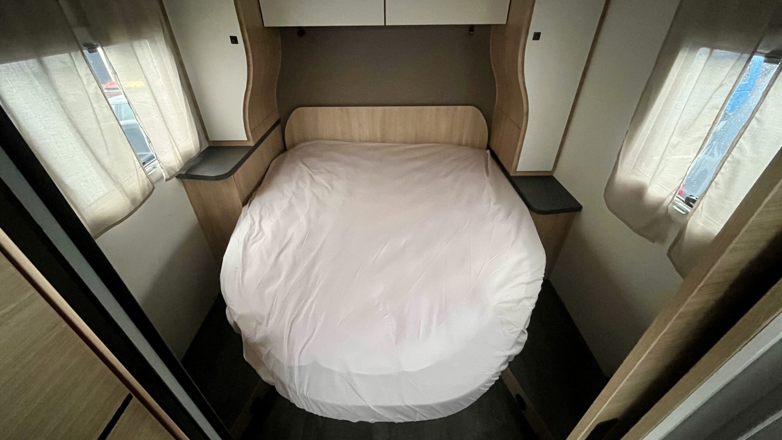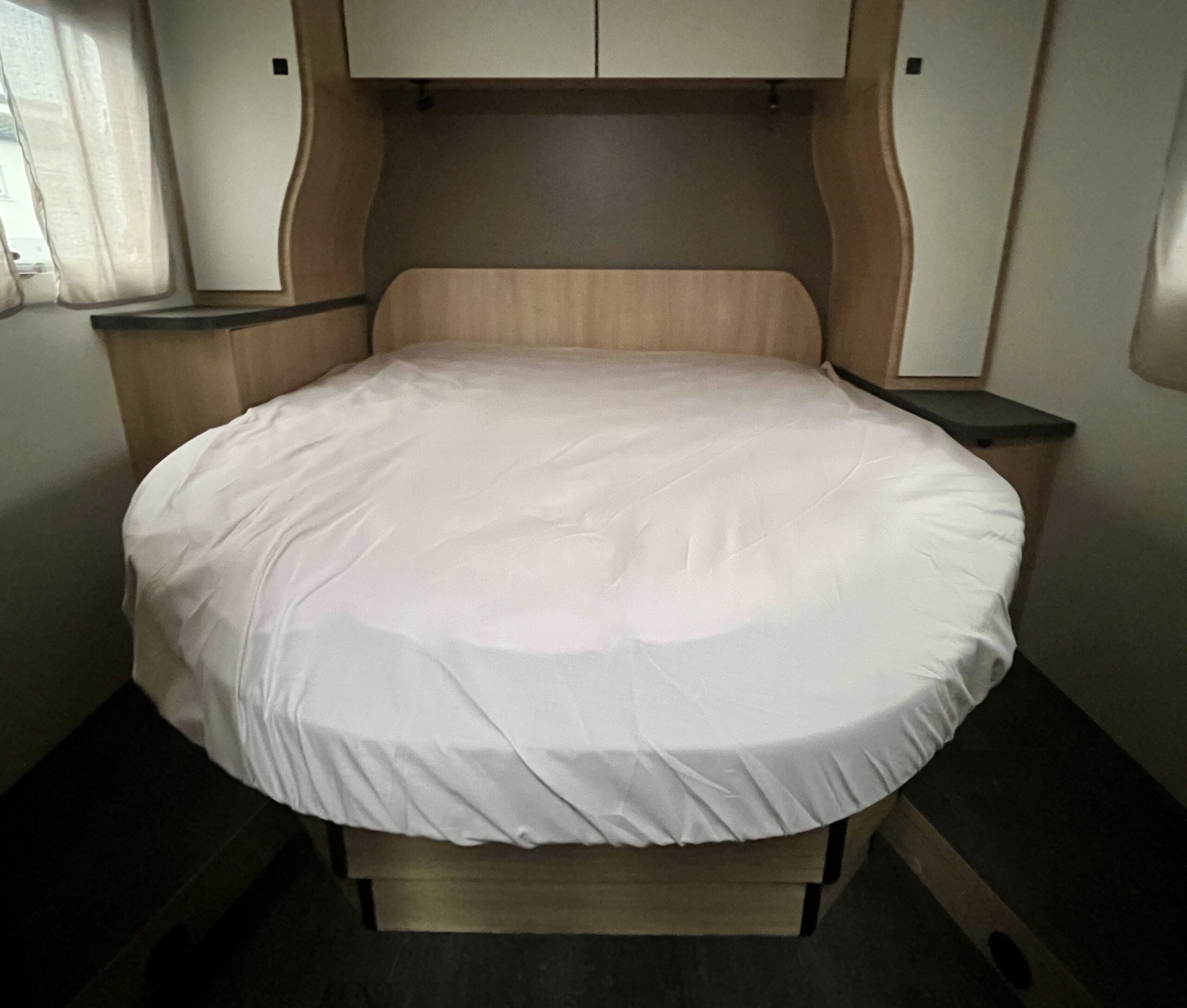 Low-profile motorhome with island bed