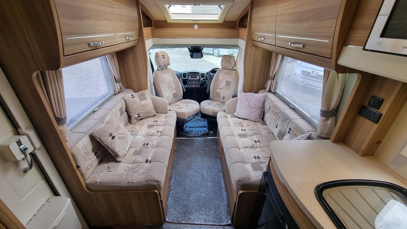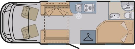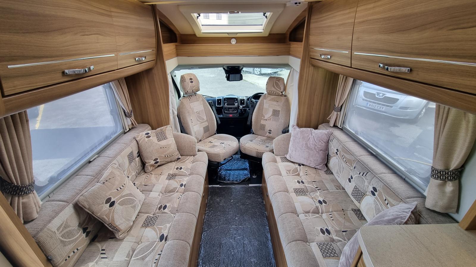 Inside, you’ll find a spacious front lounge with two side-facing settees that convert into two forward-facing belted travel seats or a transverse double bed. At the rear, a fixed French bed provides a comfortable and convenient sleeping area. The fully equipped kitchen features everything needed for on-the-road cooking, while the large washroom adds a touch of home comfort.