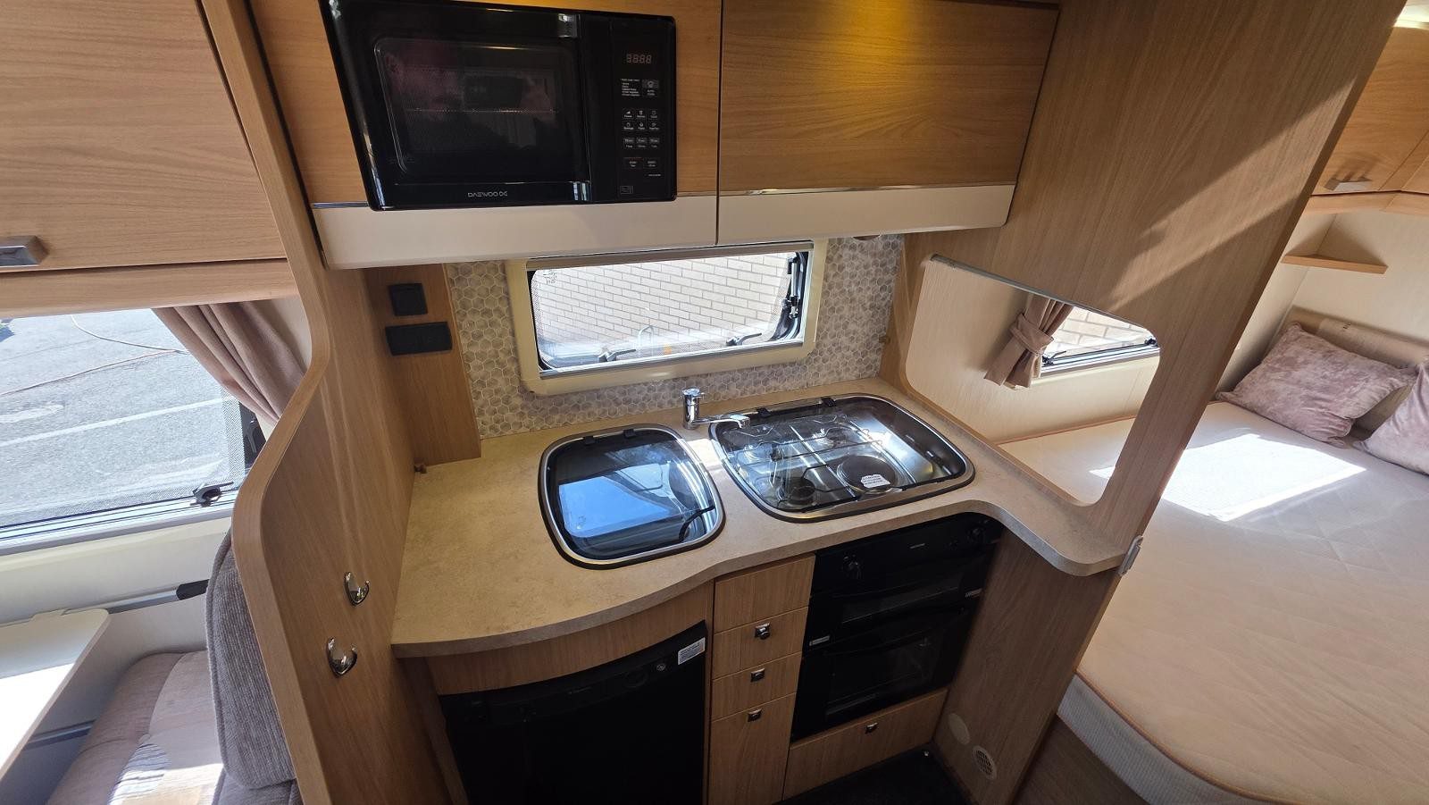 | Equipment | 12V Lighting, 240V Lighting, Awning, Blinds, Central Heating, Cooker, Double Glazing, Fixed Double Bed, Grill, Hand Washbasin, Mains Hookup, Microwave, Oven, Sink |