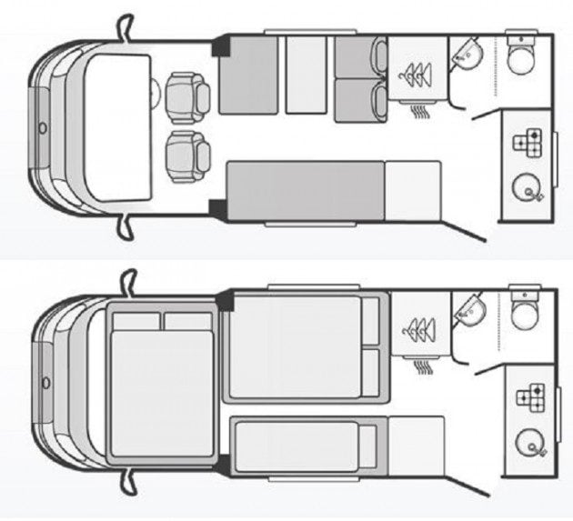 Sleeping: Over-cab double, dinette converts to double, side bench as single