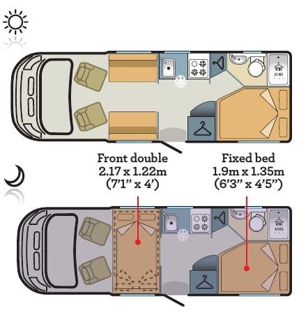 | Equipment | 12V Lighting, 240V Lighting, Awning, Blinds, Central Heating, Cooker, Double Glazing, Fixed Double Bed, Hand Washbasin, Mains Hookup, Sink, Sunroof |